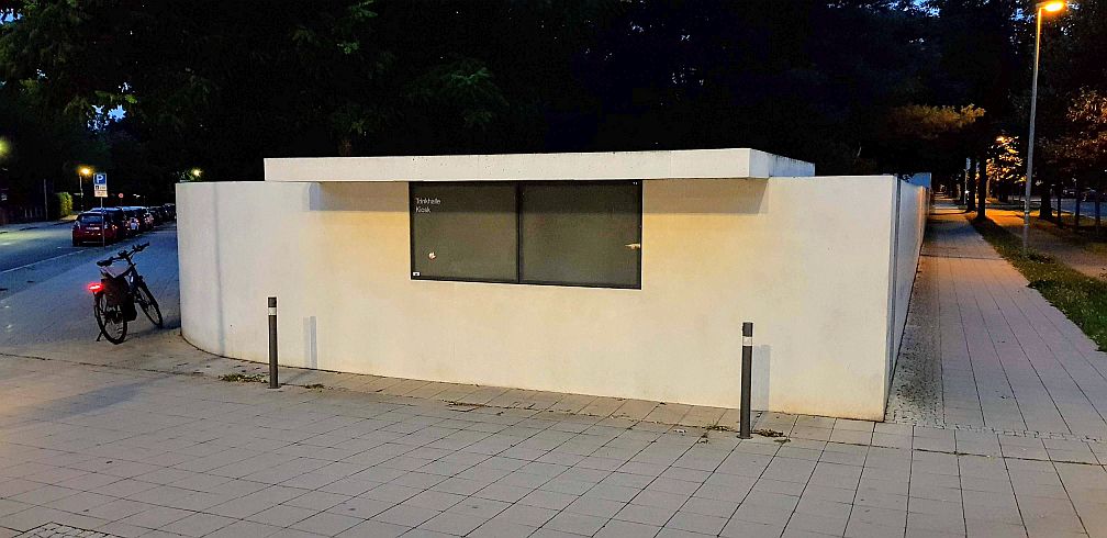 Unweit der Häuser hat auch Erics Mutter für ein paar Jahre mit ihrer Familie gelebt. Das mussten wir uns natürlich ansehen. Also noch ein schneller Abstecher in die Straße Kienfichten, um ein paar Fotos zu machen. Auch den ehemaligen Kiosk der Siedlung (Trinkhalle) entdeckten wir. Langsam dämmerte es schon, wir wollten den Abend jedoch nicht beschließen, ohne wenigstens einen ersten Blick auf das berühmte Bauhaus-Gebäude geworfen zu haben -> Tina vor dem Bauhaus -> Eric vor dem Bauhaus