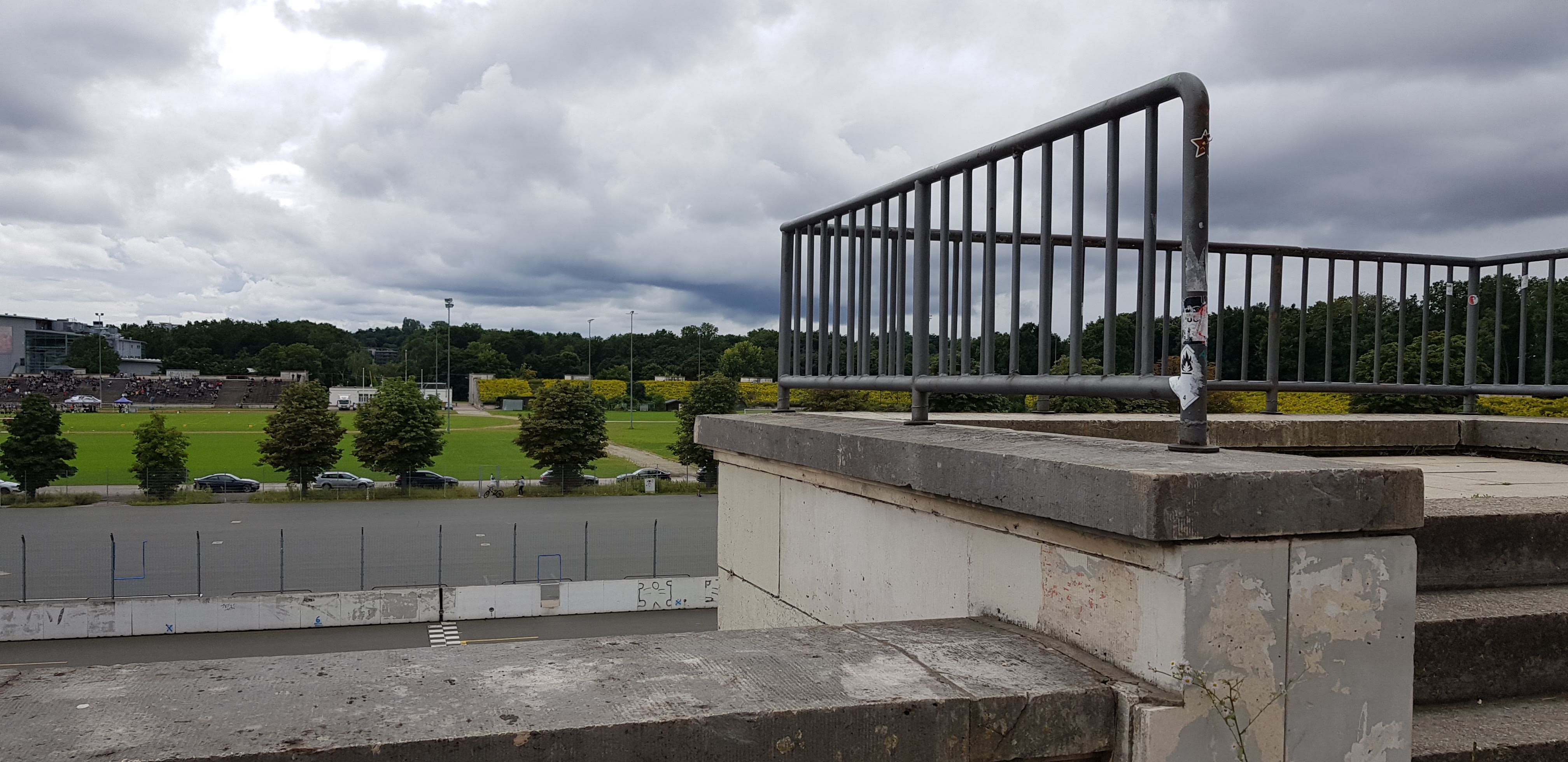 Obwohl es schon dunkel geworden war, wollten wir mit dem Rad anschließend noch eine kurze Runde Richtung Stadion und Zeppelinfeld drehen. Die Fußballfans hatten sich schon auf den Heimweg gemacht, doch von nebenan erklangen noch vertraute Riffs und Beats. Mono Inc. waren für ein Strandkorbkonzert (es regnete inzwischen in Strömen) zu Gast in der Stadt. Auf der Suche nach einem guten Platz, um ein wenig Zaungast zu spielen passierte dann jedoch das Missgeschick. Tina übersah eine dicke Kabelbrücke und stürzte Kopf über mit dem Rad. Fazit - Tina heile, Fahrrad ordentlich verbogen. Ob es morgen noch fahrtüchtig ist müssen wir gucken. Pudelnass und etwas frustriert ging es zurück zum Campingplatz. Für heute gute Nacht!